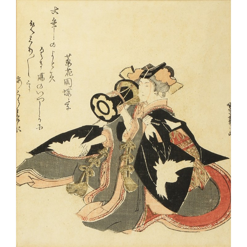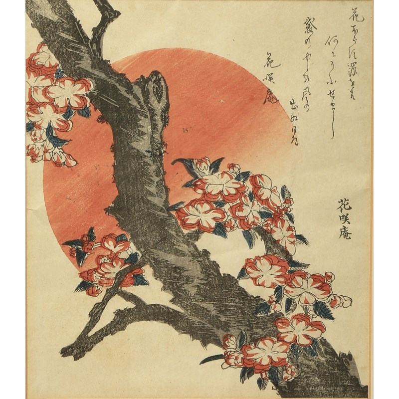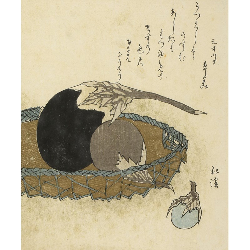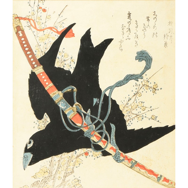 Variously including: aubergines in a basket by Totoya Hokkei; a wine cup and kettle by Yashima Gakutei; a fox about to catch a beauty with a rope by Kitagawa Utamaro I; a courtesan with a drum by Katsushika Hokuun; and the last three by Katsushika Hokusai and depicting a courtesan with a monkey, a flowering branch of prunus before a red sun, and a crow perched on a sword, all mounted in modern frames and glazed, the frames 28cm x 25cm each. (7)