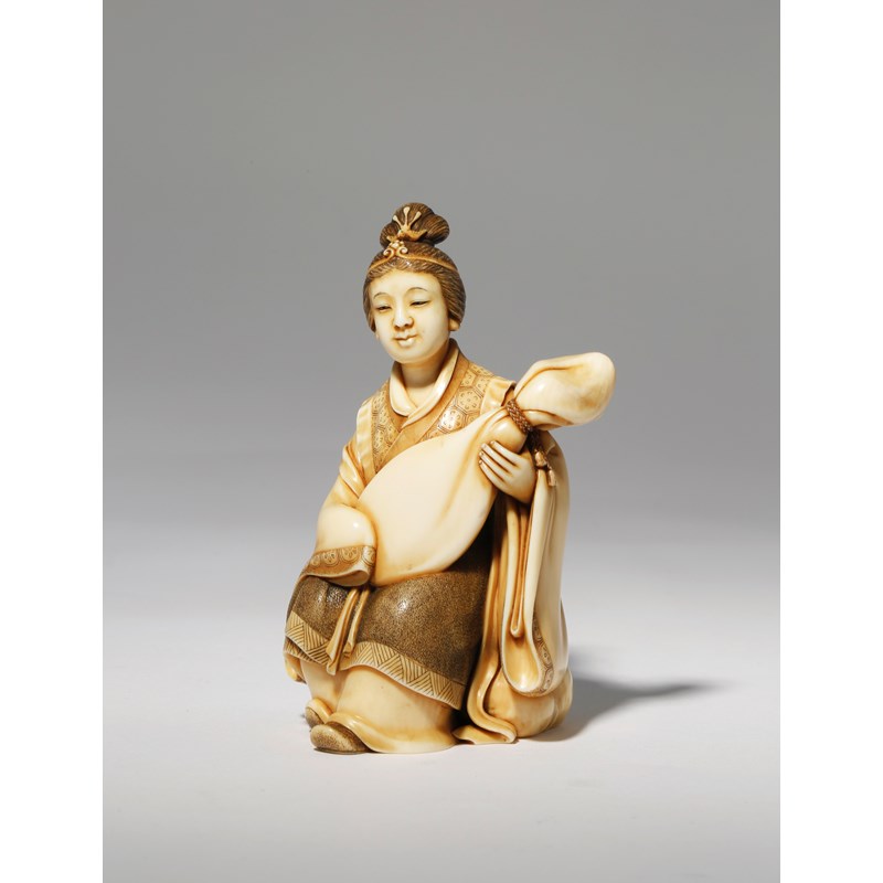 Depicting a beauty sitting on a rock and holding a biwa (lute) wrapped in a fabric cover, her hair tied up in an elegant chignon with a small diadem to the front and a ho-ho bird on top, wearing long robes and a vest decorated with a hexagonal cell pattern, the base with a two character seal mark in a red lacquer tablet for Shomin, 11.2cm.