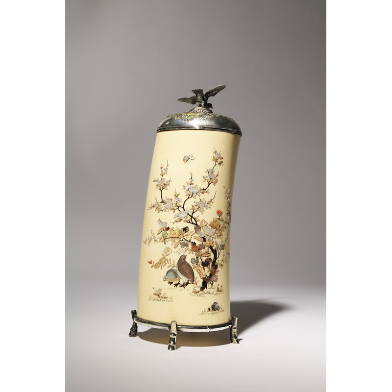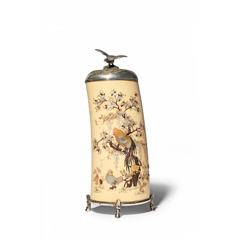 The tall body raised on four elegant silver feet shaped as curved sections of bamboo, finely decorated with a cockerel perched on a prunus tree with a hen below, the other side with two quails under flowering branches of peony, a small butterfly fluttering above, all in mother of pearl, stained ivory, horn and coral inlays, the silver lid with formal scrolling patterns in cloisonné enamel and topped with a large bird of prey perched on a rock, unsigned, 28.5cm. (3)