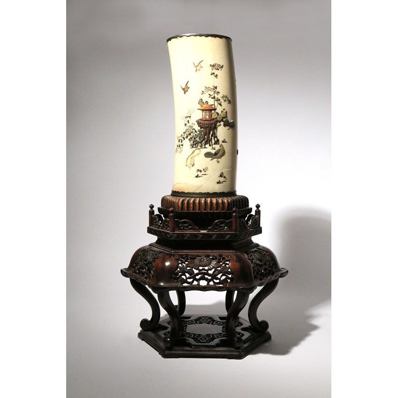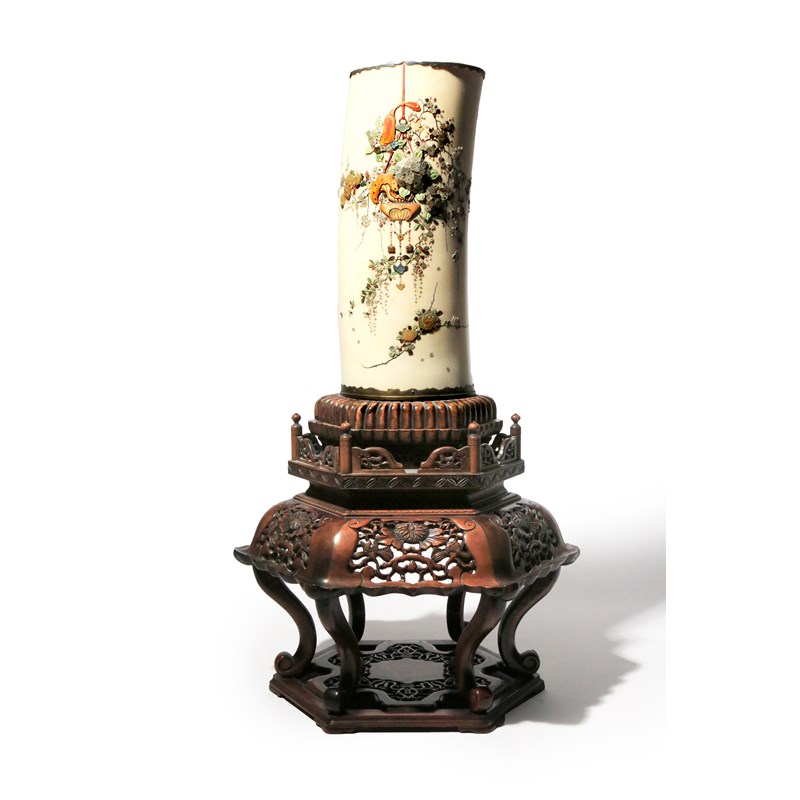 With coral, mother of pearl, horn and stained ivory inlays, decorated to one side with a large hanging basket filled with an assortment of chrysanthemum, prunus blossoms, wisteria and peony flowers, with jewels below, the other side with a small lantern-shaped bird feeder on a rootwood table, with branches of chrysanthemum and wisteria flowers around, four small birds surrounding it, a two character rectangular seal mark to the side for Masamitsu, with silver mounts to the rims, all raised on a hexagonal wood stand with tall cabriole legs, the tusk 34cm, 67cm overall. (2)