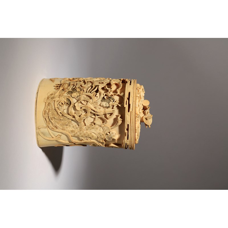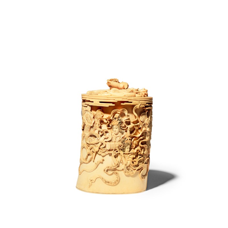 λ A JAPANESE IVORY VASE AND COVER MEIJI 1868-1912 The cylindrical body decorated in high relief...