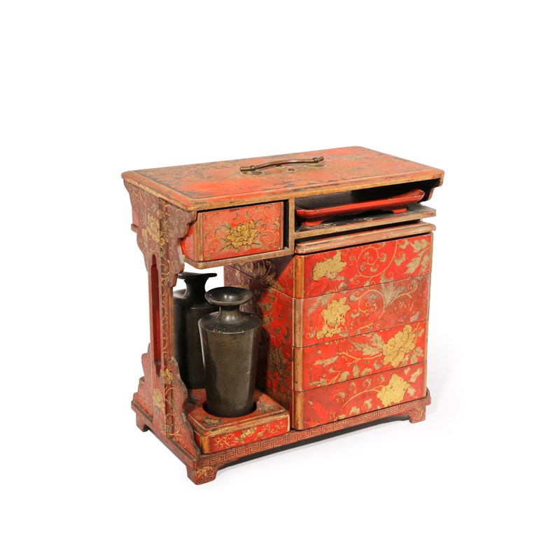 The rectangular frame, tray, drawer and four-tiered box and lid decorated with lotus flowers and leafy scrolls in gold on a red lacquer ground, with a band of key fret above the foot, together with two pewter sake bottles, tokkuri, 35.7cm x 36.4 x 20cm overall. (a lot)