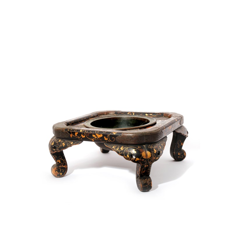 The square body raised on four short cabriole legs, decorated with red and gold chrysanthemum and leafy tendrils, with metal mounts to the corners etched with further patterns of scrolling leaves, the copper liner encased in the centre, 45cm x 45cm x 21.5cm. (2)