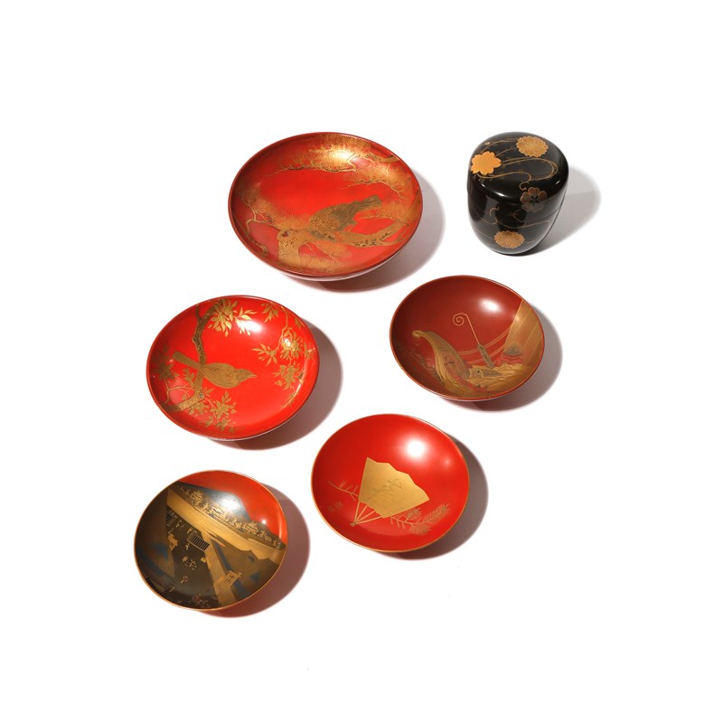 The short rounded body decorated with prunus flowers amongst scrolling tendrils, together with five red lacquer and gold takamaki-e sake cups, sakazuki; two decorated with birds perched on branches; one with the hull of a ship laden with sacred objects, possibly a reference to the Seven Gods of Good Fortune's ship, takarabune; the fourth with a fan inscribed ki and a branch of pine, signed Motomasa to the front and Kizo Tatsumi Kiyomasa to the back; the fifth with a scene of many figures walking down a row of shops, with Mount Fuji in the background, signed Byakkisai, 13.1cm max. (5)