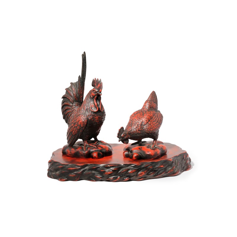 A PAIR OF JAPANESE RED LACQUER MODELS OF CHICKENS 20TH CENTURY One bird standing upright and the...