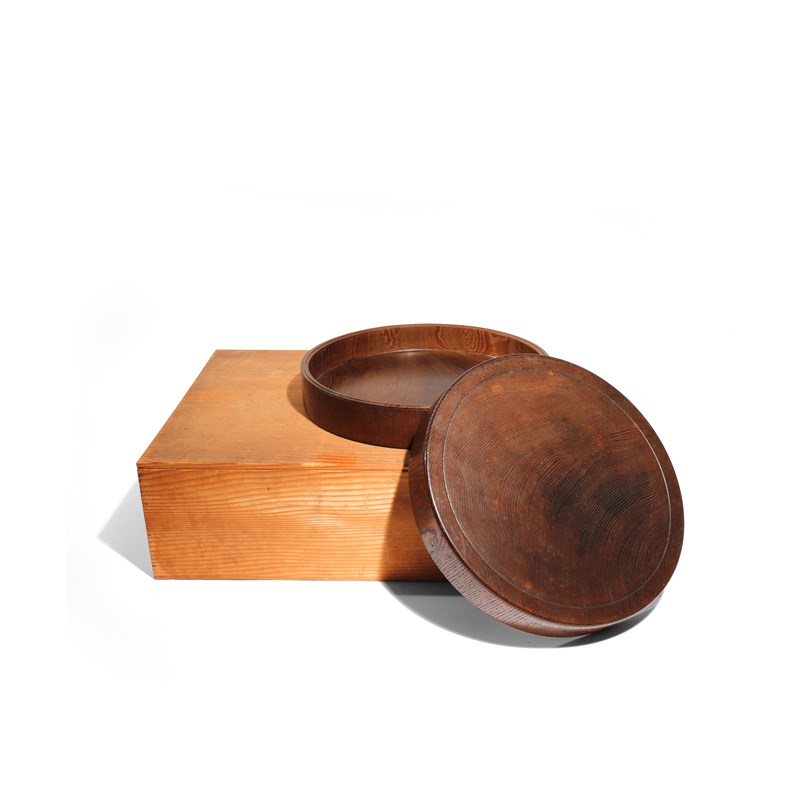 The circular body in keyaki (Japanese zelkova), the undecorated surface emphasizing the natural wave-like wood grain, together with a fitted tomobako box, 34cm dia. (4)