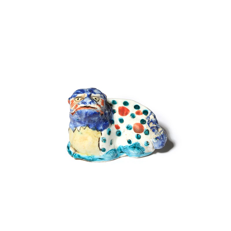 Modelled as a crouching lion dog, shishi, the mythical beast with its head raised and painted in red, blue, yellow, green and black enamels, with a small aperture to its back and with the mouth open, the flat base with gauze marks, 8.4cm.