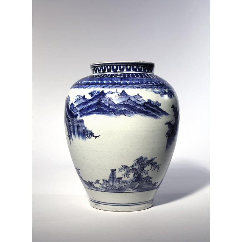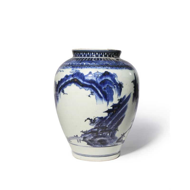 A JAPANESE KO-IMARI BLUE AND WHITE JAR C.1680 The bulbous body decorated in dark underglaze blue...