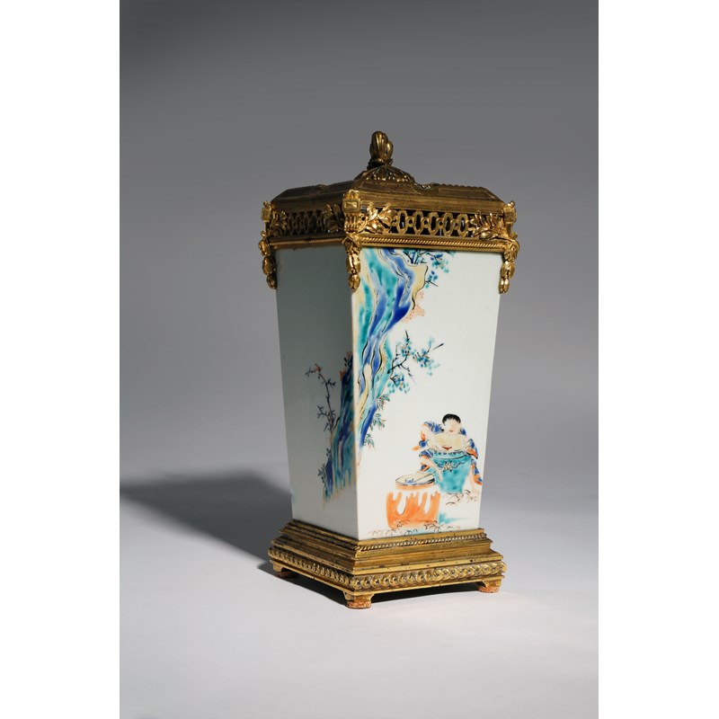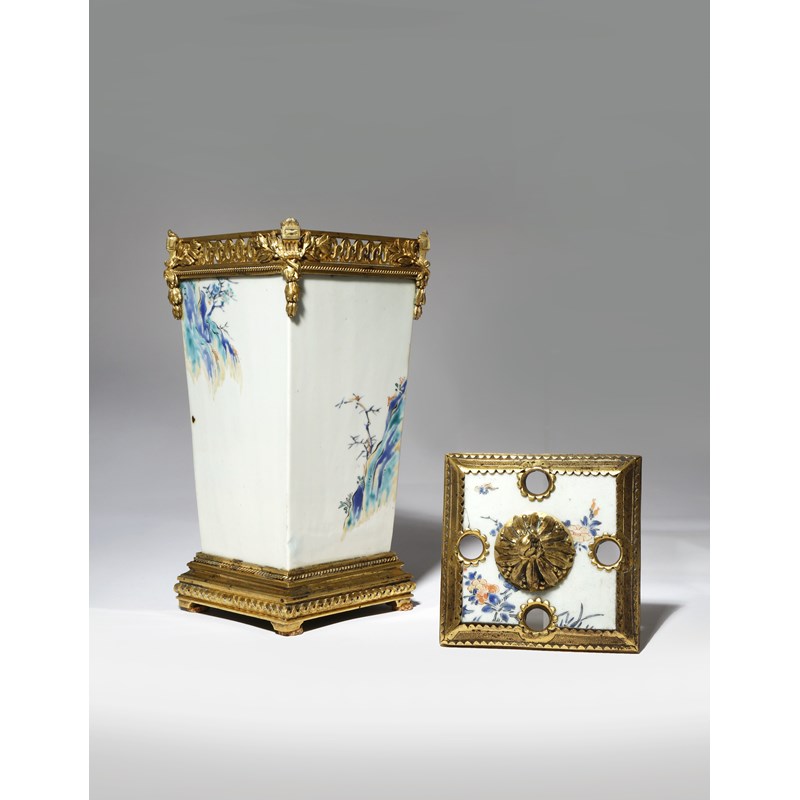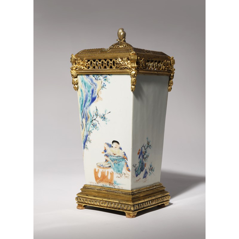 Originally a sake bottle, tokkuri, decorated in cobalt, yellow, black, cyan and orange enamels, with a continuous design of a figure hugging a large jar, holding a small sake cup in his right hand and merrily drinking the contents, with another jar in front of him, possibly a variation on the subject of Hob in the well (before the fall), with flowering branches growing from craggy rocks to the side and reverse, the lid with prunus flowers and four apertures, the vase richly decorated with ormolu mounts with leafy garlands and topped with further leaves and grapes, the ormolu base inscribed Escaliers de Cristal Paris, 26cm. (2)