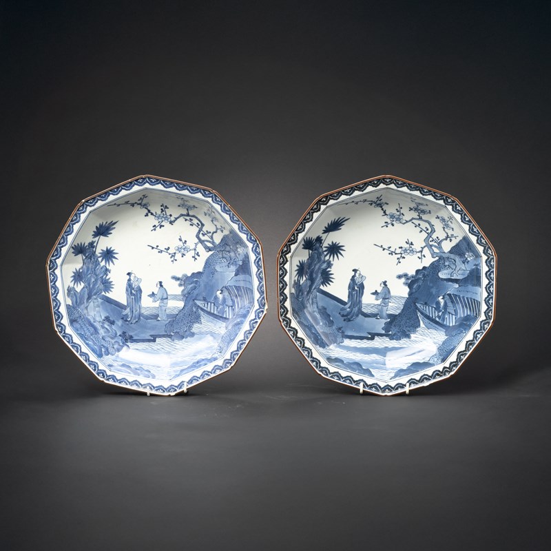 The decagonal body decorated in underglaze blue with a lady and her attendant in a river landscape, with palm trees beside them and a flowering prunus tree above; a man observing them from a small boat moored to the side; the rim painted with a border of lappets and with a brown edge; the reverse with karakusa scrolls and a fuku mark to the base, 33cm; together with another dish of the same design. (2)