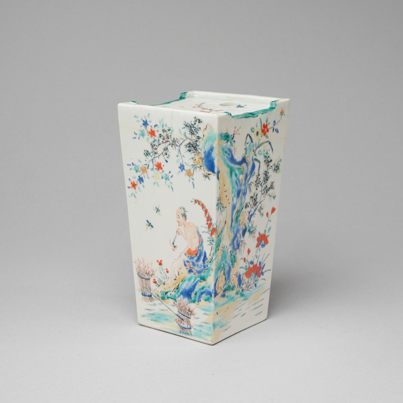 Of tall square-section form, the top ridged and with a circular aperture; the sides decorated with a man resting, smoking a pipe beside bundles of twigs, a large rock beside him issuing many flowers and leaves; the other faces with birds in flight, further flowers, one lion dog and a phoenix; all rendered in colourful enamels, some added later; the base with a label reading 'Stockspring Antiques, The Dragon and the Quail', 18.2cm.