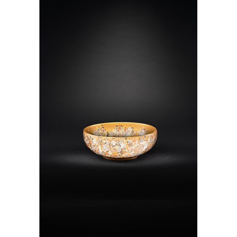 The rounded sides decorated all-over to the interior and exterior with the 'Thousand Faces' pattern, with details of the figures' clothes and accoutrements picked out in gilt; the foot rim with a border of brocade pattern, the base signed Kinkozan, 15.2cm.