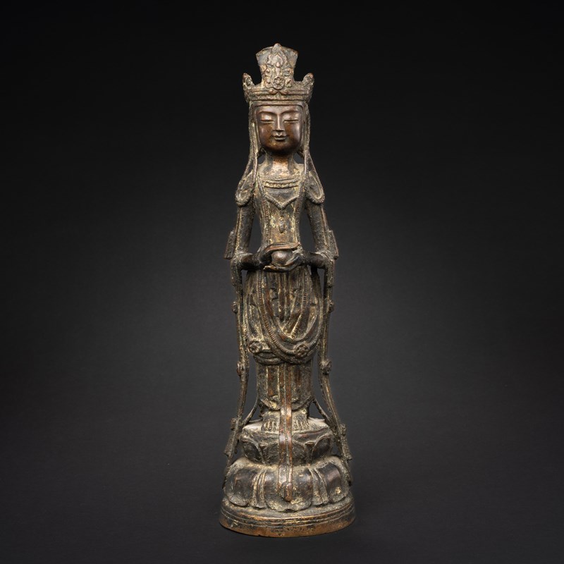 The Bodhisattva of Mercy is depicted standing on a double-lotus throne, holding a jewel in her hands; she wears a tenne draped over her forearms and beaded jewellery; her headdress features the image of Amida Nyorai; 37.8cm.