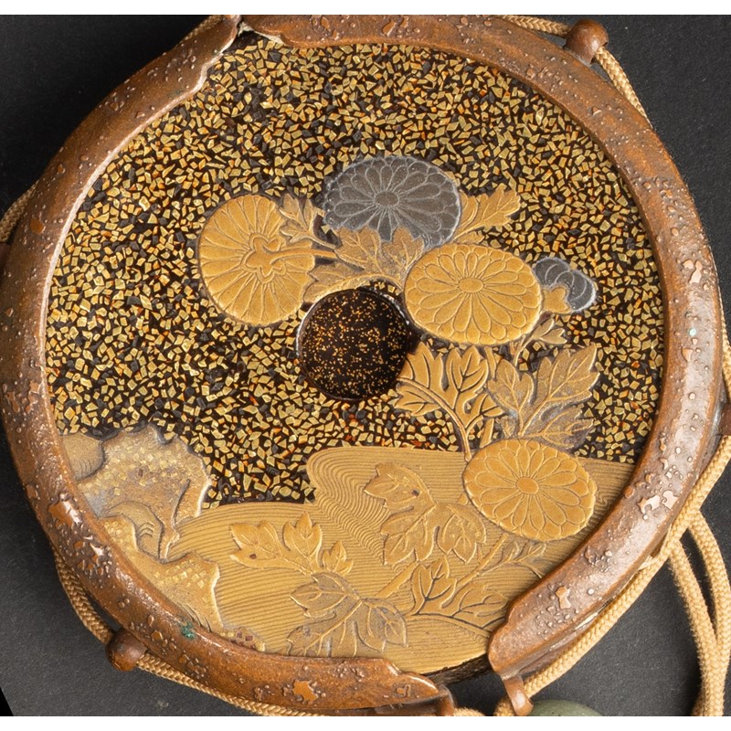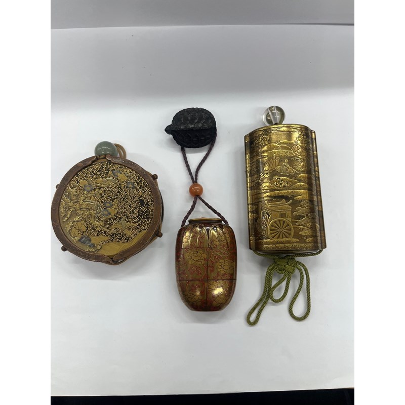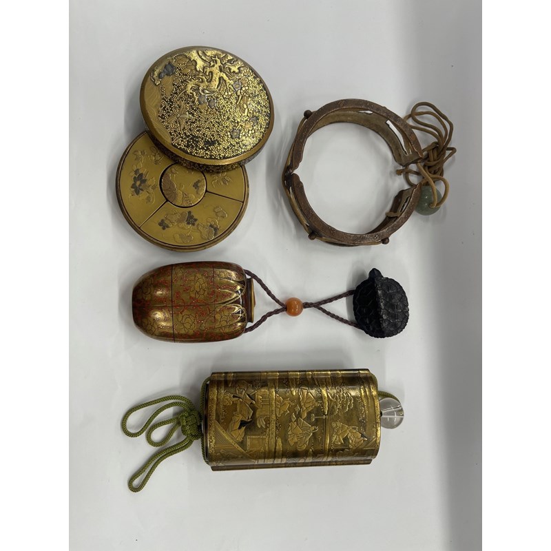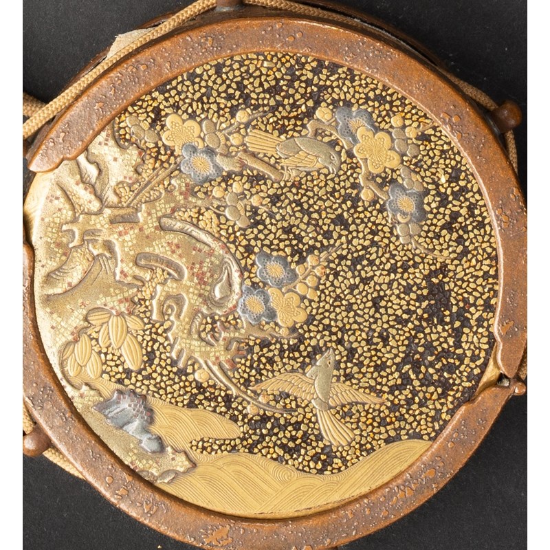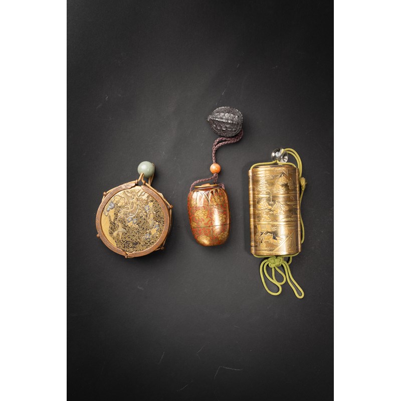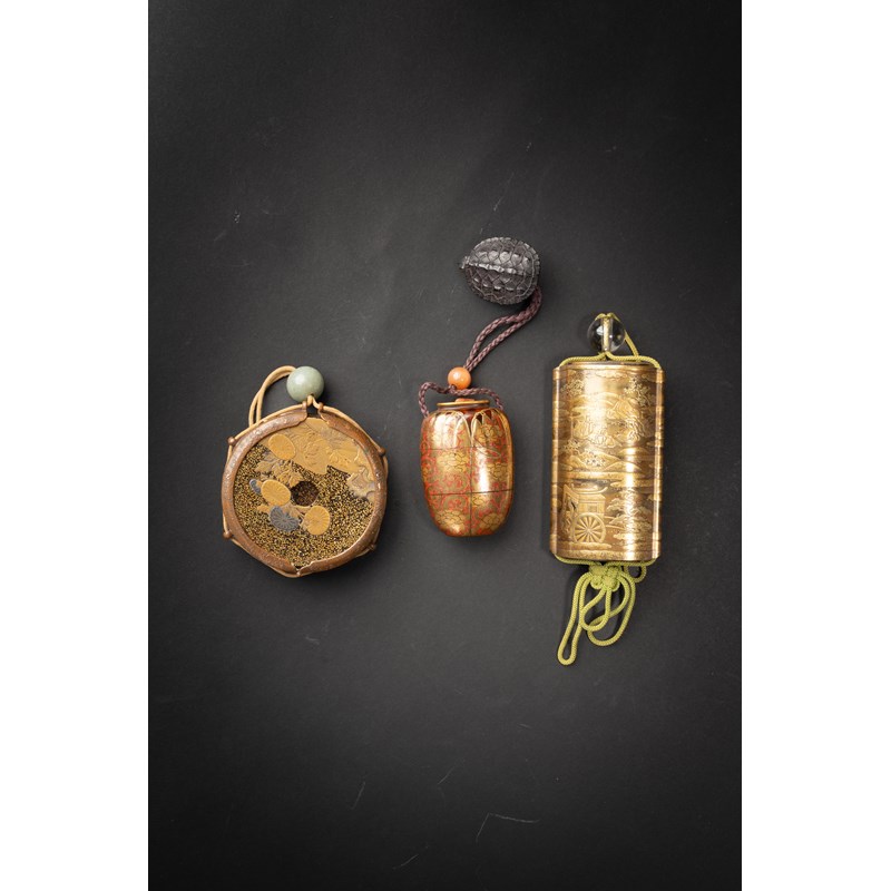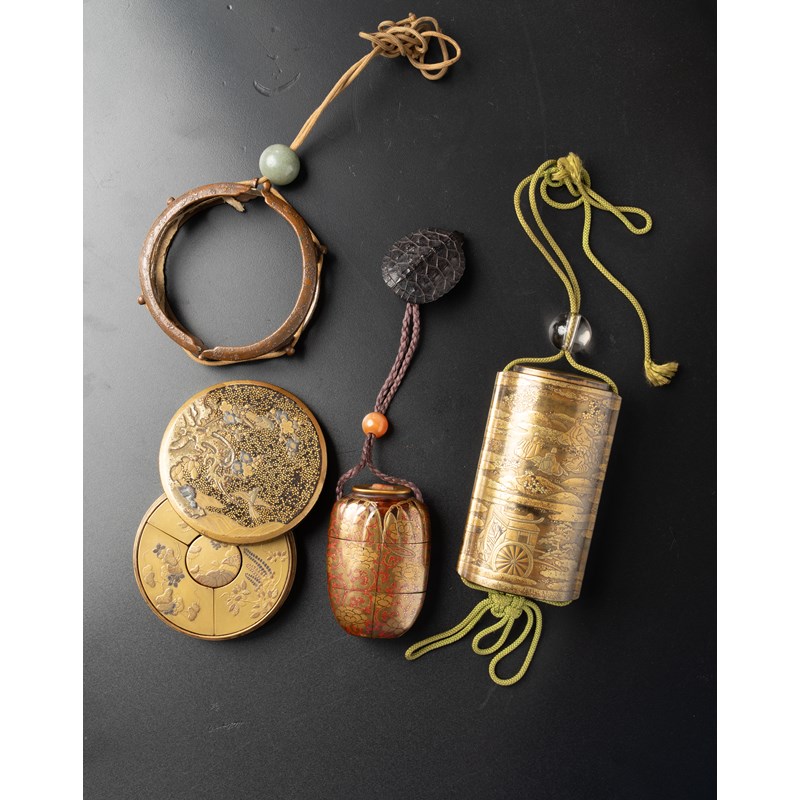 Including a saya (sheath) inro, the outer casing decorated with many figures at leisure in a garden wearing Heian-style garments, probably a scene from the Genji Monogatari (Tale of Genji); one side with a goshoguruma (ox-drawn carriage) with travellers visible inside, all rendered in gold hiramaki-e, nashiji and kirikane, the five-case inro inside in gold maki-e and the inside in nashiji; another piece a two-case inro, simulating a kinchaku (drawstring bag) encasing a pottery chaire (tea caddy and lid) with a fake lacquer lid topped with a branch of coral, the mock fabric decorated with large flowerheads and scrolling tendrils, with an agate ojime and a wood netsuke carved as a turtle with amber eyes; the last item a circular kobako box decorated with birds, flowers and rocks, containing four smaller boxes embellished with further blossoms and scrolling tendrils, all rendered in gold and silver himaraki-e and kirikane; the box encased in a metal hinged frame for use as a sagemono, together with a silk pouch, 9.8cm max. (12)