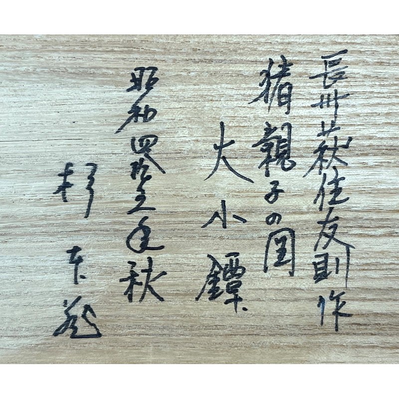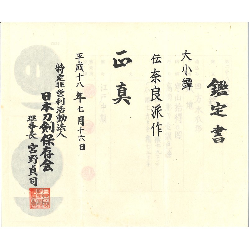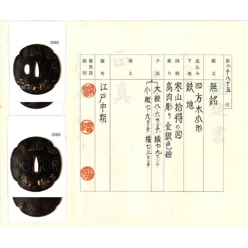 Both in iron inlaid with gold, silver and shakudo; decorated with mirror images of the two semi-legendary zen eccentrics Kanzan and Jittoku reading a handscroll, with pine above them; the reverse of each tsuba with a waterfall and mountains beyond; in an associated kiri box; with a Kanteisho certificate by the Nihon Token Hozon Kai (NTHK) describing a large and small (daishō) set of tsuba, mumei (unsigned), attributed to the Nara School, mid-Edo period; of shiho mokkogata shape (four corners rounded and squared off); certified Shoshin (genuine), issued by the NTHK president Miyano Teiji, on 16th July, Heisei 18 (2006); with the three seals of the committee judge members Miyano, Yamasaki, and Ohashi.