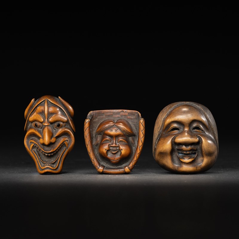 THREE JAPANESE WOOD NETSUKE OF MASKS