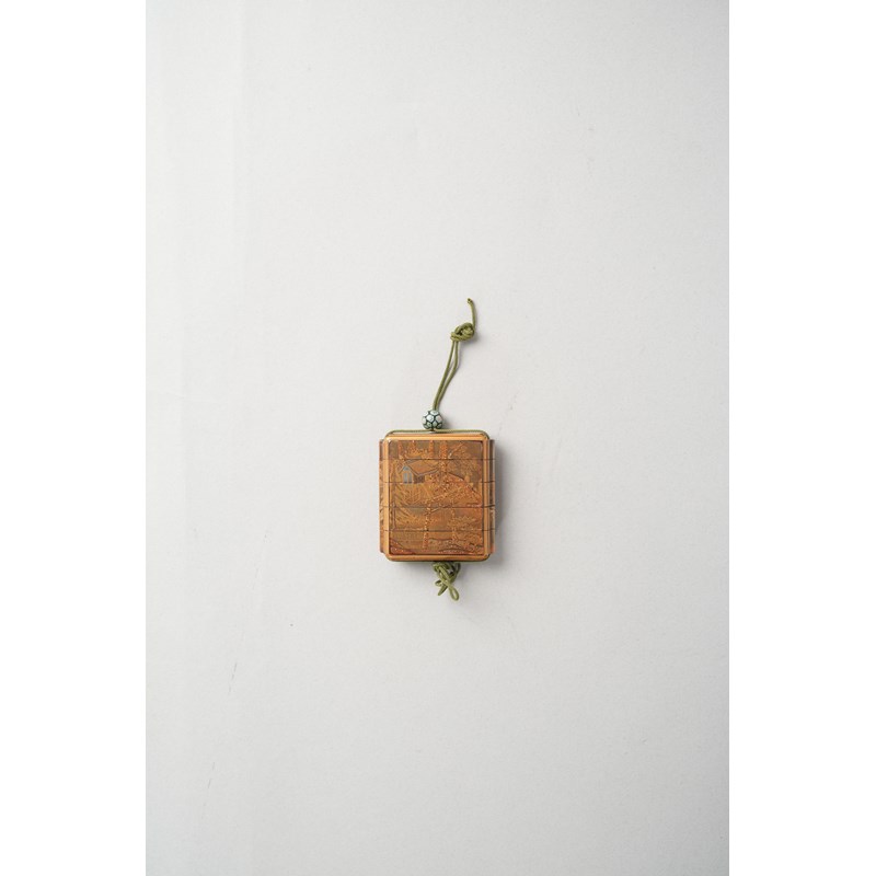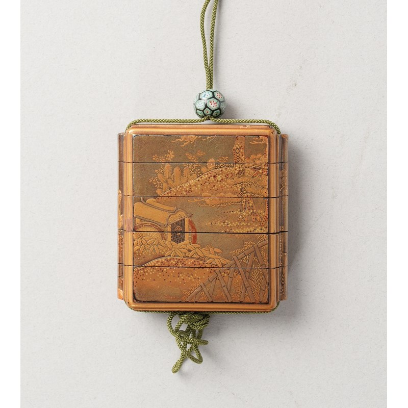 Decorated in hiramaki-e and kirikane lacquer, one side with a goshoguruma (ox-drawn carriage) beside pine and bamboo trellis, possibly a reference to The Tale of Genji; the reverse with a small shrine and a tori gate amongst further trees; attached to a glass ojime.