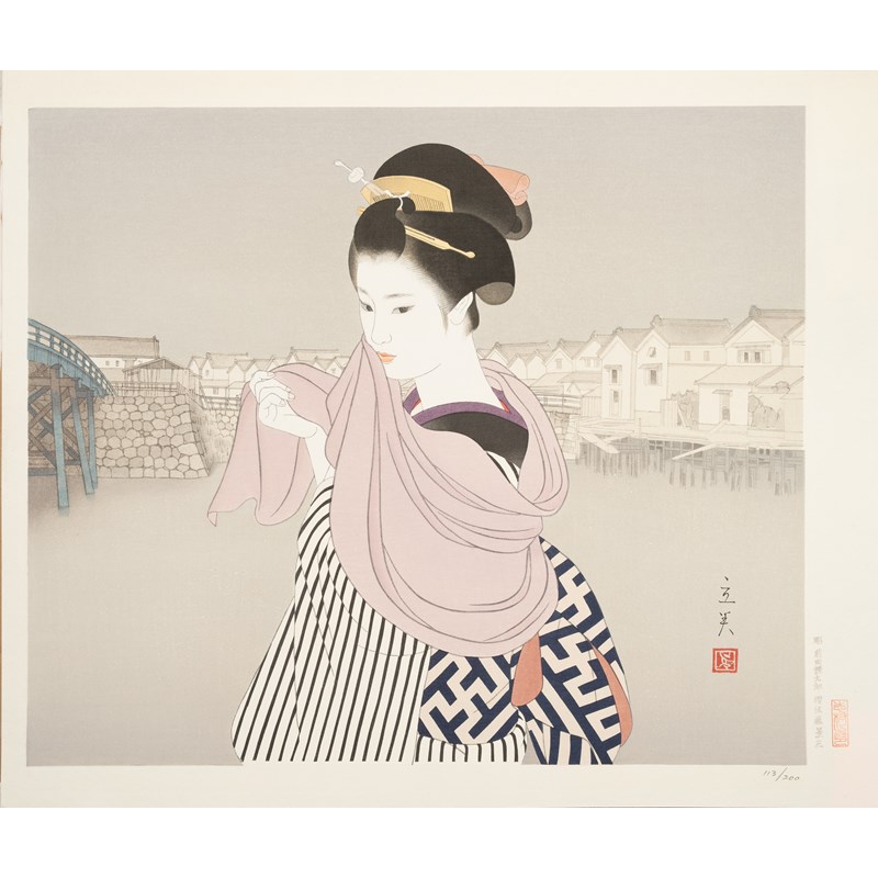 A large Japanese woodblock print depicting a beauty standing before a row of buildings, signed and sealed, carved by Kentaro Maeda, printed by Keizo Sato, with a red Tatsumi Kenin seal (Tatsumi seal of approval) in the lower right margin, numbered 113/200.