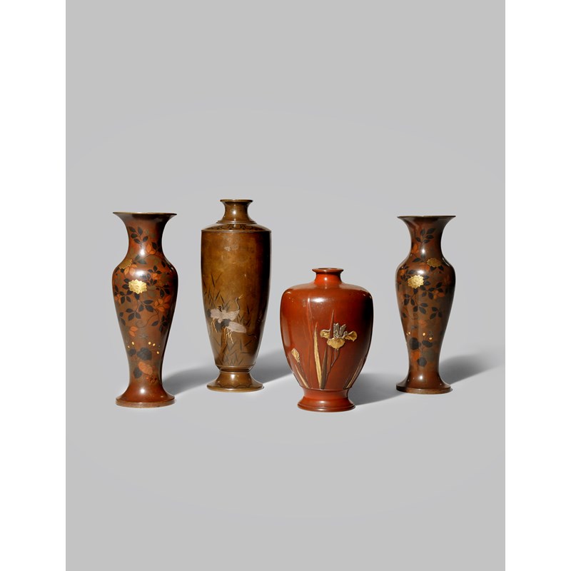 FOUR JAPANESE INLAID BRONZE VASES