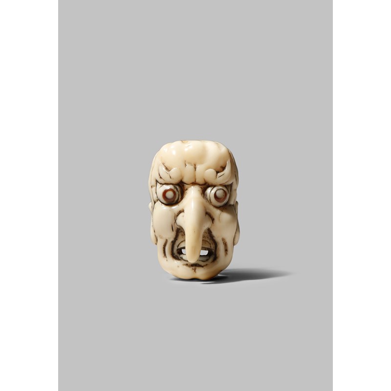 Carved as a grimacing tengu mask with a crooked nose, its pupils inlaid with horn, with a two character signature to the back, 3.9cm.