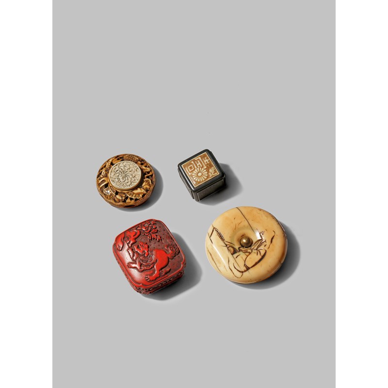 One a marine ivory manju with a rubbed out figure, another a ryusa with lotus, marine animals and chrysanthemum, the third a metal and ivory hako netsuke with the character for ki and a chrysanthemum mon, the fourth a tsuishu lacquer hako with a shishi and brocade balls on an asa-no-ha ground, signed Yosei tsukuru, 5.2cm max.(5)