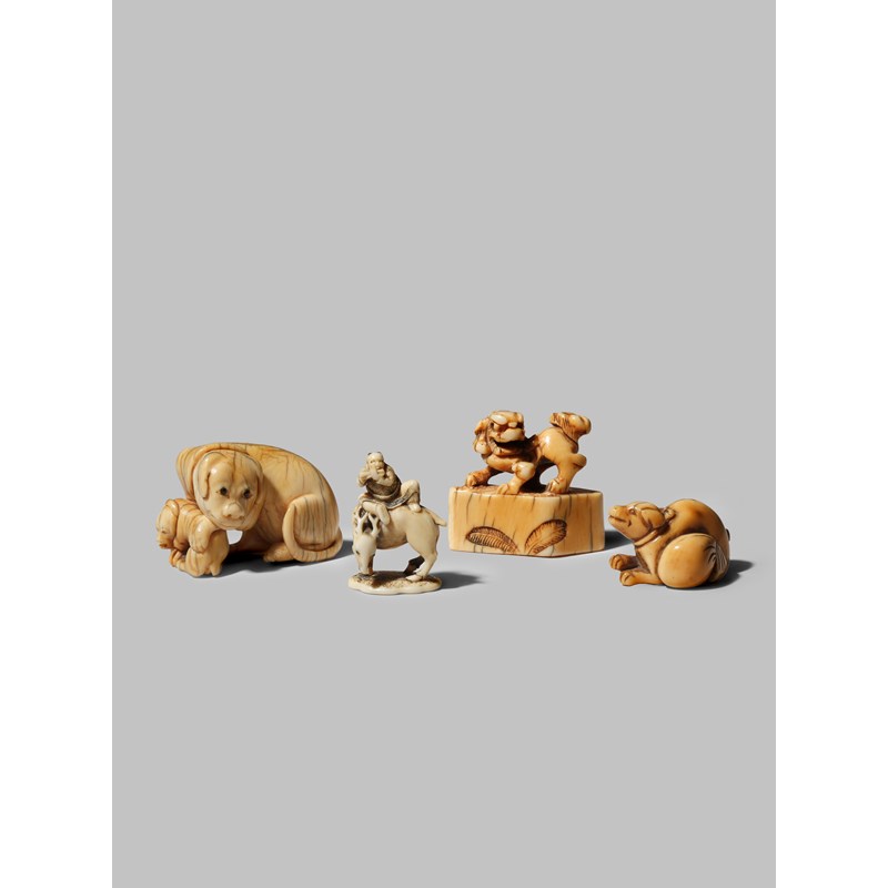 FOUR JAPANESE IVORY NETSUKE EDO/MEIJI PERIODS Two carved as dogs