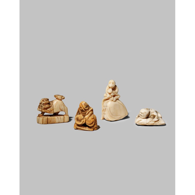 FOUR JAPANESE IVORY NETSUKE EDO/MEIJI PERIODS Variously carved as a shishi on a rhomboid base