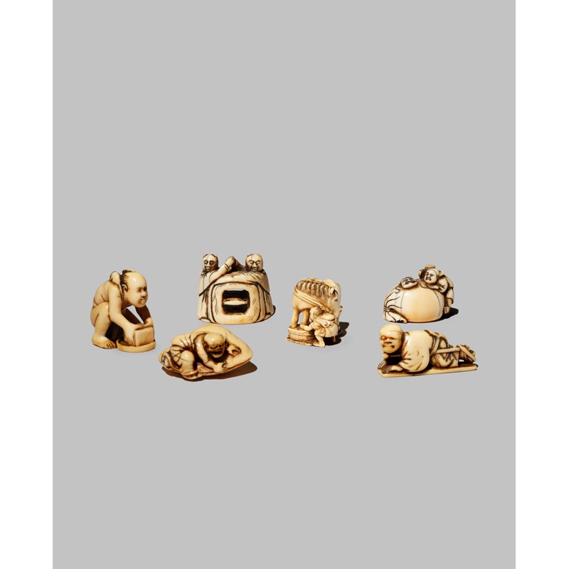 SIX JAPANESE IVORY NETSUKE EDO/MEIJI PERIODS Variously carved as two karako arm wrestling over a...