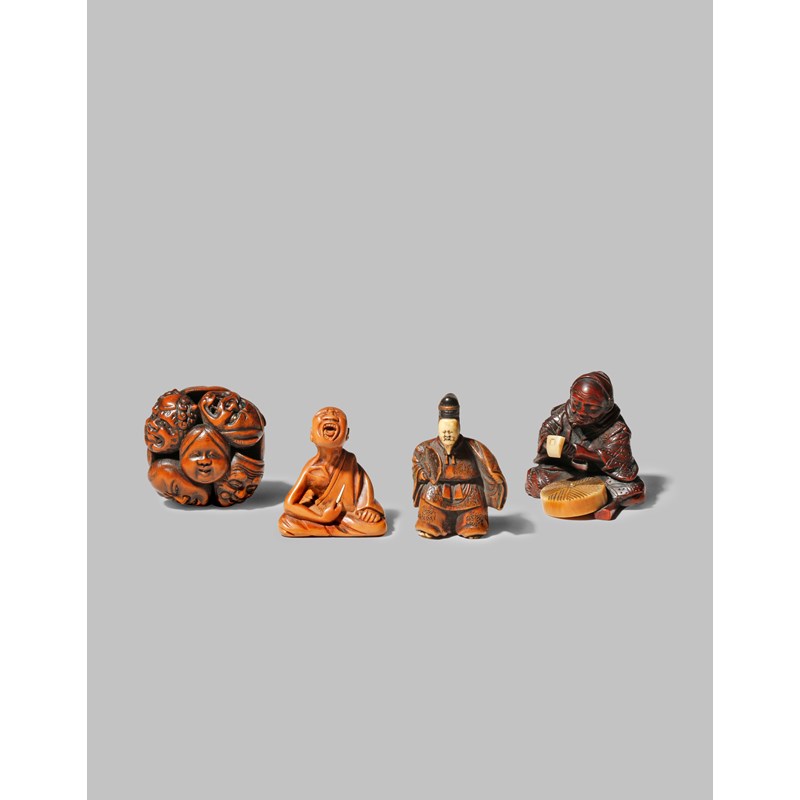 FOUR JAPANESE WOOD NETSUKE MEIJI 1868-1912 One carved as a man using a nose tickler to make...