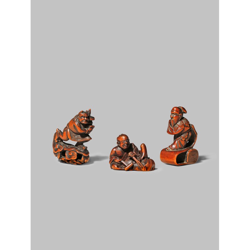 THREE JAPANESE WOOD NETSUKE MEIJI 1868-1912 One depicting Tentoki or Raiden standing on a cloud...