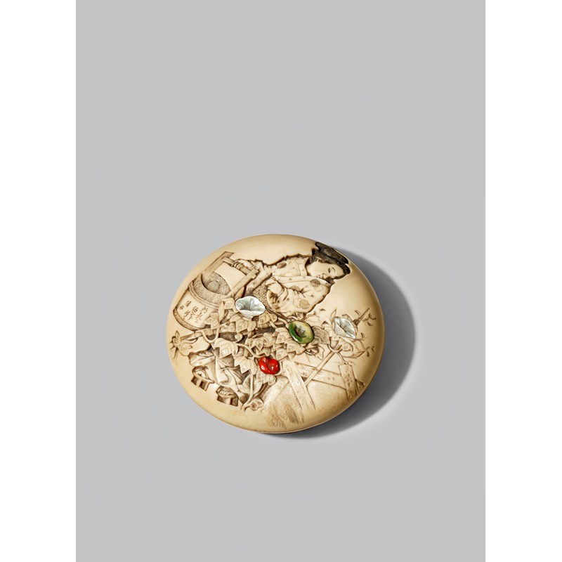 The lid decorated with a beauty carrying a water bucket and gazing at morning glories growing over trellis, the petals inlaid with mother of pearl, coral and stained ivory, the underside with a small stream, grasses, butterflies and dragonflies, signed Chikahiro in a mother of pearl oval reserve, 7.9cm. (2)