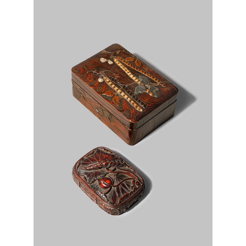 A JAPANESE WOOD INK CASE EDO/MEIJI PERIODS The lid and body decorated with lotus leaves and a bud