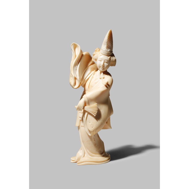 A JAPANESE IVORY OKIMONO MEIJI 1868-1912 Depicting a bijin dancing with a fan and wearing an...