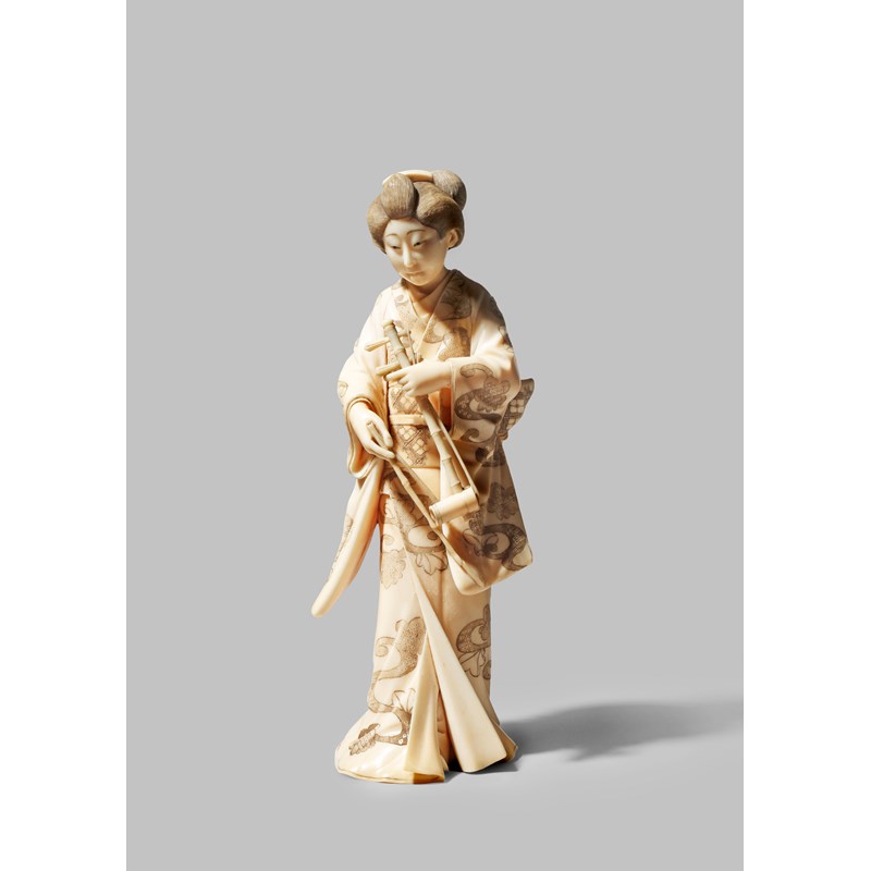 A JAPANESE IVORY OKIMONO MEIJI 1868-1912 Carved as a bijin holding a kokyu (string instrument)
