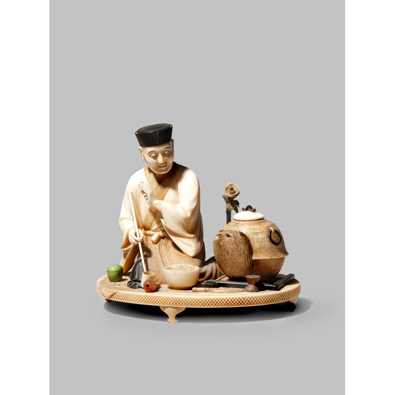 Depicting a kneeling man surrounded by implements to perform a tea ceremony, a large kettle beside him turning into a tanuki, with details picked in coloured ivory, the base with three butterflies with inlaid elements surrounding a large red lacquer tablet with a four character signature for Akishige, another seal mark beside it, 11cm.