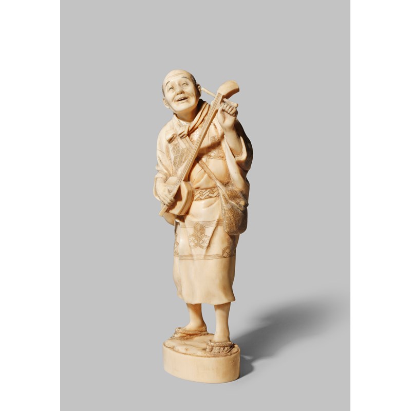 A JAPANESE IVORY OKIMONO MEIJI 1868-1912 Carved as a musician tuning his shamisen