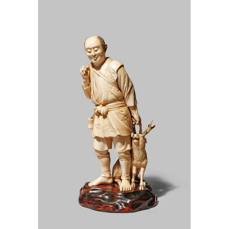 Depicting a man returning from the hunt, a bow and arrow slung over his shoulder and holding a rope fasten around a small deer at his feet, the animal with naturalistically carved antlers and fur, its belly with a two character signature, together with a fitted wood stand, 20.5cm. (2)
