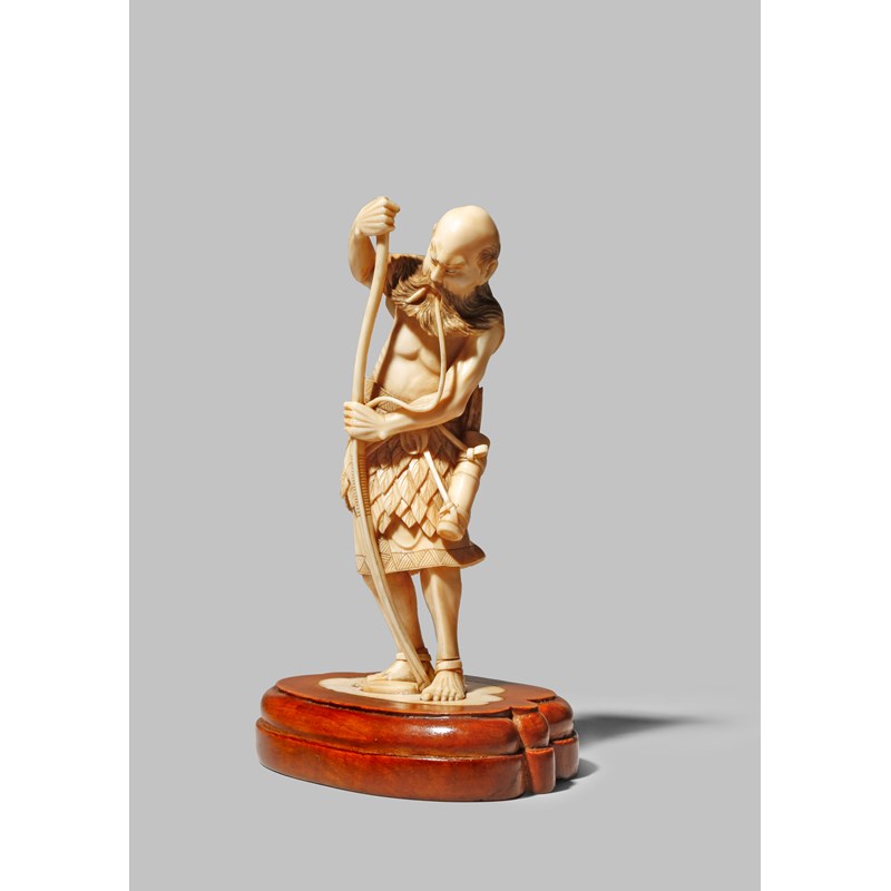 A JAPANESE IVORY OKIMONO MEIJI 1868-1912 Carved as an archer stringing his yumi bow