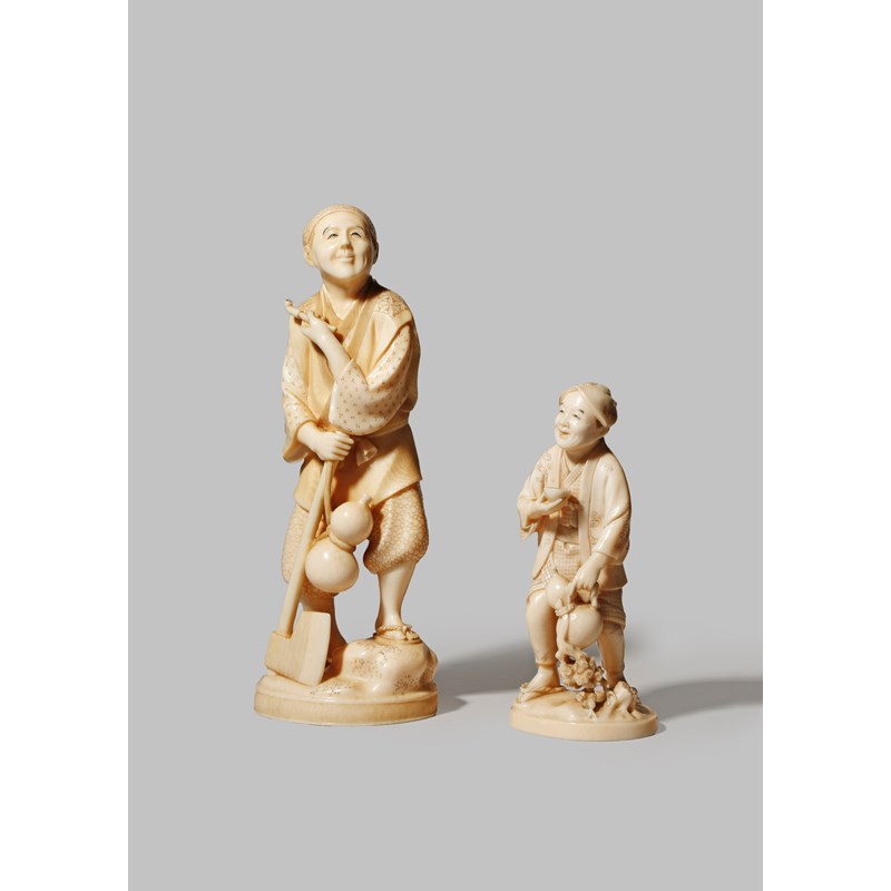 TWO JAPANESE IVORY OKIMONO MEIJI 1868-1912 One depicting a farmer smoking his kiseru pipe and...