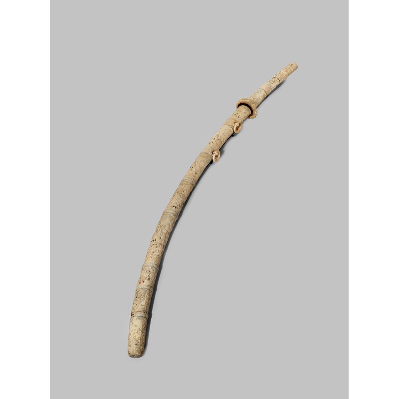The scabbard and mounts carved in low-relief with continuous scenes of warriors engaged in battle, tennin playing musical instruments and panels of karakusa scrolls, with some details inlaid with mother of pearl, stained ivory, horn, and small metal beads, signed and with the blade inscribed, 142cm. (2)