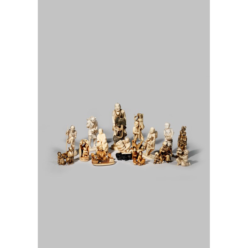 FOURTEEN JAPANESE IVORY OKIMONO MEIJI 1868-1912 Variously carved as figures engaged in daily life
