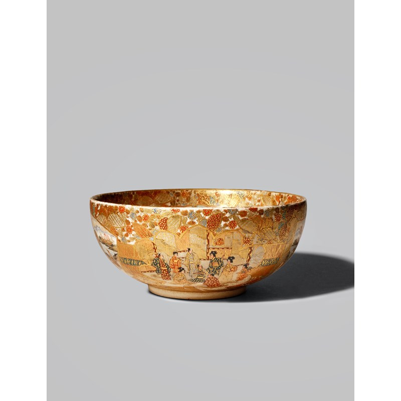 A JAPANESE SATSUMA BOWL MEIJI 1868-1912 Decorated to the outside with shaped panels containing...