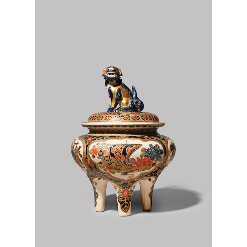 The short body raised on four slender legs, decorated in thick enamels with shaped panels containing flowers and sacred objects, the lid with similar decoration and topped with a ferocious-looking shishi, the base inscribed Dai Nihon Satsuma yaki Meizan with kao, a paper label for Empire Bazar underneath the lid, 21cm overall. (2)