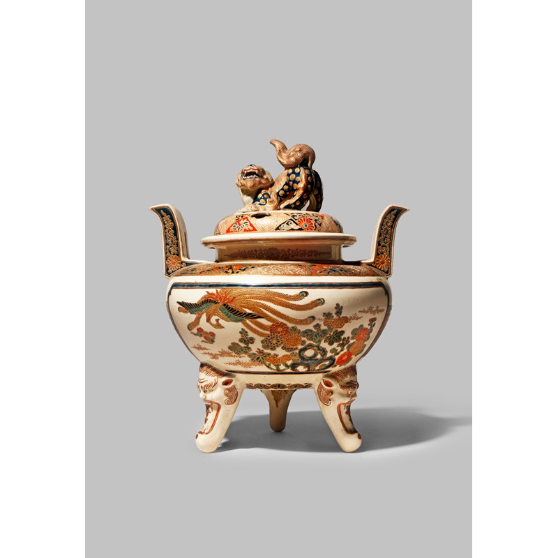 The bulbous body with tall handles and raised on three mythical beast-mask feet, decorated with panels containing a ho-ho bird flying over flowers and rockwork to one side, with chrysanthemum and peonies to the other, the shoulder with brocade designs, chrysanthemum flowerheads and paulownia mon, the lid with similar decoration and topped with a shishi bearing its teeth, the base inscribed Satsuma yaki Tomonobu, 25cm overall. (2)