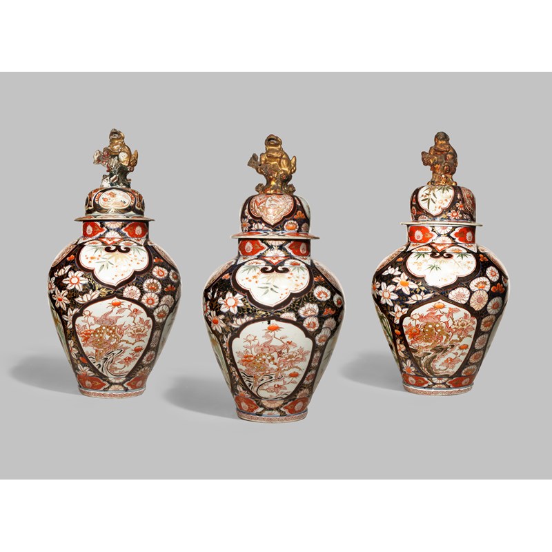 THREE JAPANESE ARITA IMARI VASES AND COVERS FROM A GARNITURE
