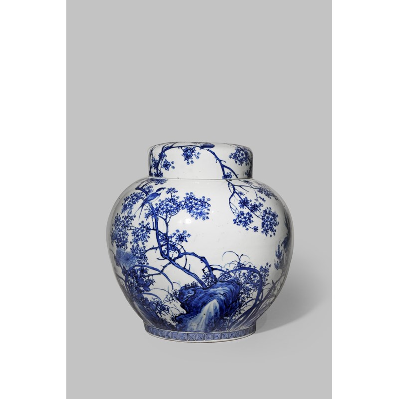 A LARGE JAPANESE BLUE AND WHITE JAR, COVER AND INNER LID