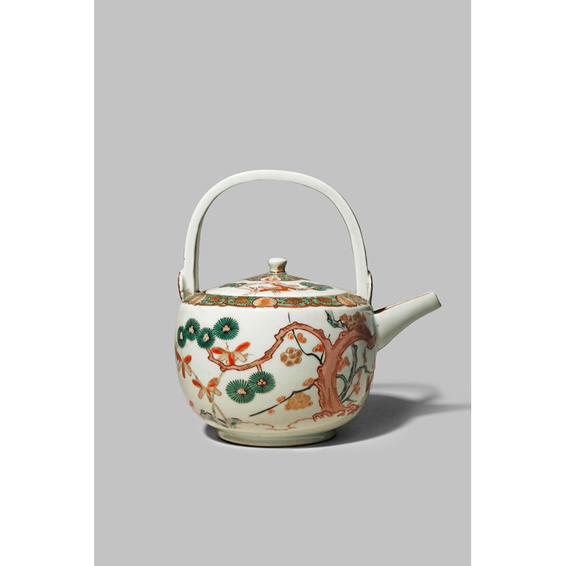 The body decorated with the Three Friends of Winter in green, red and purple enamels with details in gilt, the shoulder with stylised palmettes and scrolling leaves, with a chrysanthemum mon over the spout, 19cm. (2)