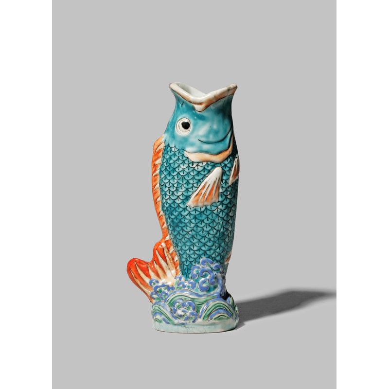The fish depicted with its mouth wide open, its tail emerging from swirling water, painted in orange, cyan, turquoise and green enamels, 16.3cm.