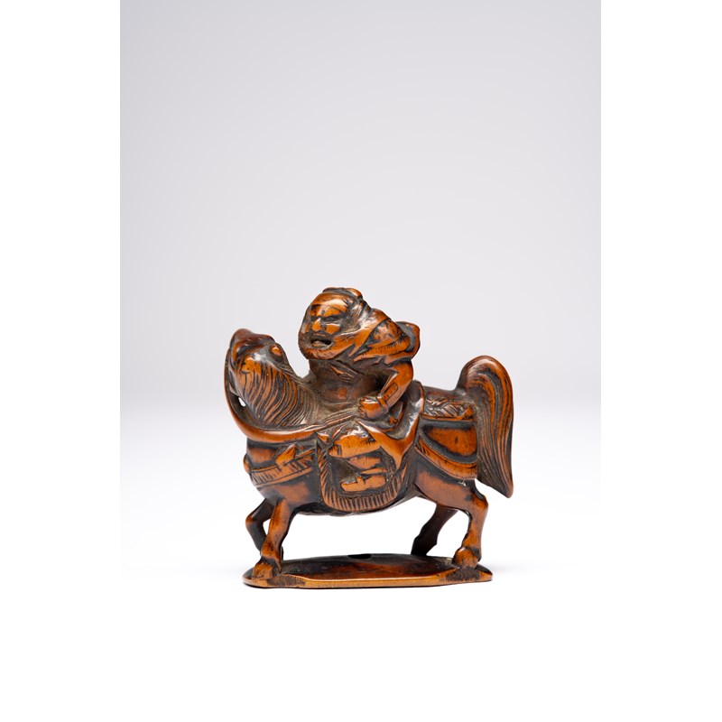 The armour-clad warrior depicted riding his horse Tokiro, his head turned to the left and with a ferocious expression, raised on a flat oval base with a central himotoshi hole, 4.3cm.