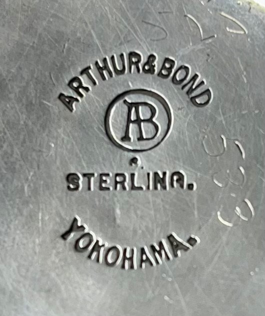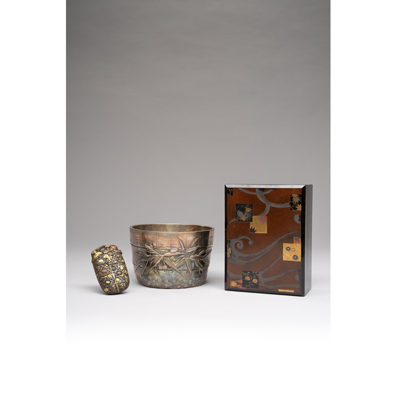 Comprising: a silver bowl shaped as a section of bamboo, with a dedication to the side dated 1920 and marked 'Arthur & Bond Sterling Yokohama' underneath; a rectangular lacquer box and cover decorated with square panels of flowers and leaves scattered over waves; and a soft metal matchbox formed as a basket of fruits, 12.6cm max. (4)